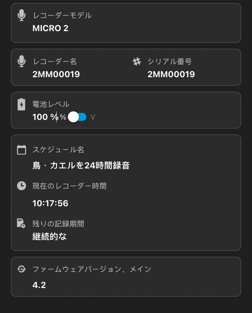 Song Meter Micro 2がBluetoothの範囲内にあり、Bluetoothビーコンを送信しているか、またはアプリとペアリングされている場合、そのステータスはアプリ内で数秒に1回更新されます。レコーダーの最後に受信したステータス情報は、アプリを終了したり、モバイルデバイスまたはレコーダーの電源をオフにしたり、レコーダーがBluetoothの通信距離外に移動したりしても、アプリで保持されます。