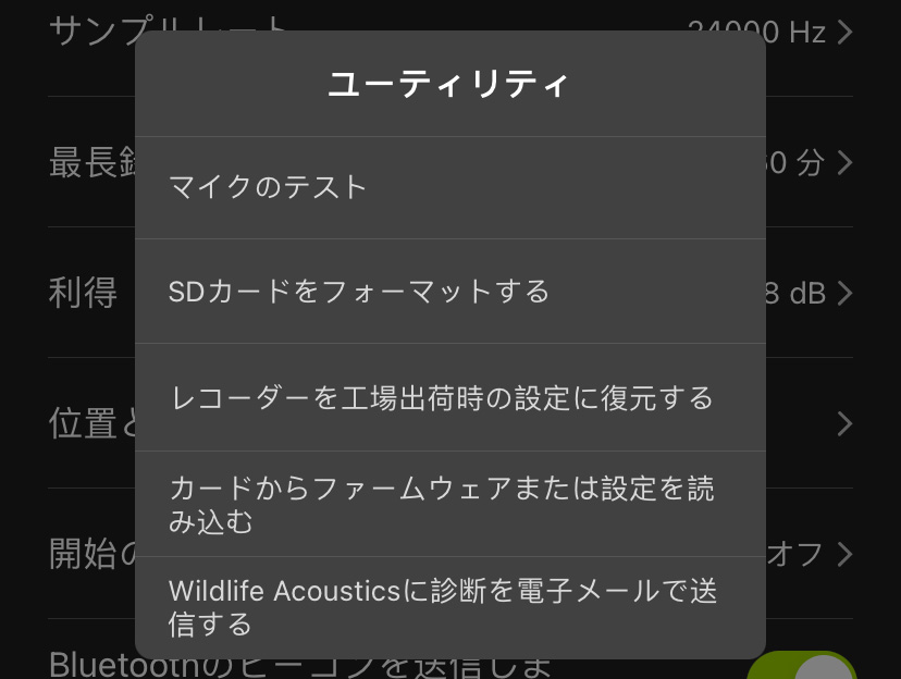 この項目をタップすると、Wildlife Acousticsサポートである宛ての空白メールが生成されます。 メールを送信するには、アクティブなインターネット回線が必要です。