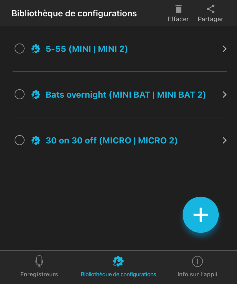 Appuyez sur cette bulle, sur le côté gauche de chaque entrée de la liste, pour sélectionner la configuration à supprimer ou à partager. Vous pouvez sélectionner plusieurs configurations à la fois.