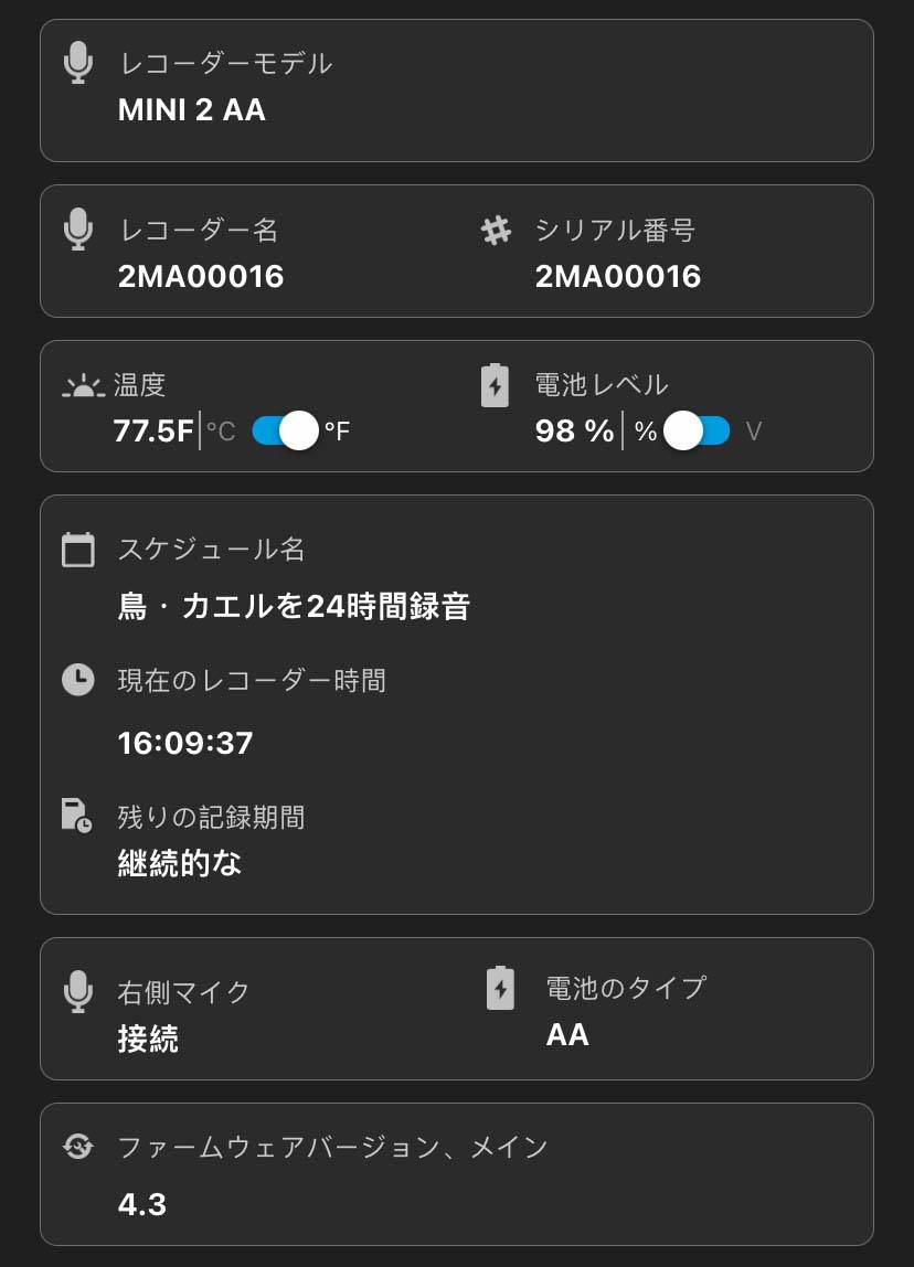 [右側マイク] | 右側のマイクが取り付けられていて、Song Meter Mini 2で検出されているかどうかを、[接続済み] または[未接続]と表示します。 | ||||||||||||||||||||||||||||||||||||||||||||||||