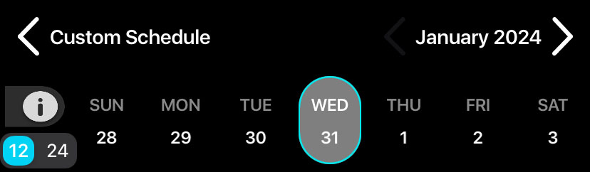 カレンダーには、日曜日から土曜日まで、一度に1週間の日付が横に並べて表示されます。現在表示されている日付は、カレンダーパネルの上部に表示されます。選択された日付が1つだけ青色の枠線の薄い灰色で強調表示されます。カレンダー画面の右上には選択した日付の月と年が表示されます。