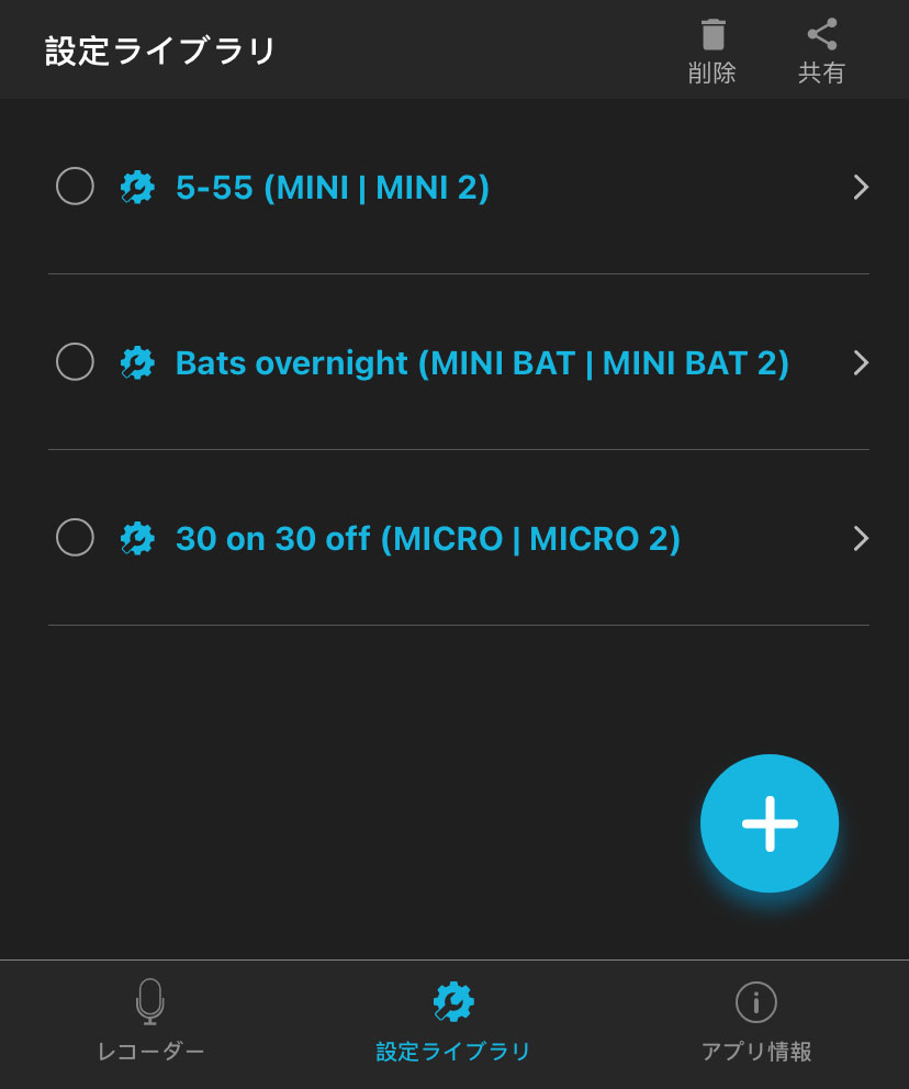 または、Song Meter Configuratorアプリの[設定ライブラリ]に保存済みの設定を作成し、この設定を複数のレコーダーに読み込んだり、同僚と共有したり、後で使用できるように保存したりできます。