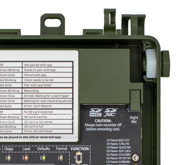 Der Song Meter Mini Bat 2-Rekorder speichert Aufnahmedateien und ein Übersichtsprotokoll auf einer SD-Karte, die in den Einschub für Speicherkarten eingesetzt wird.