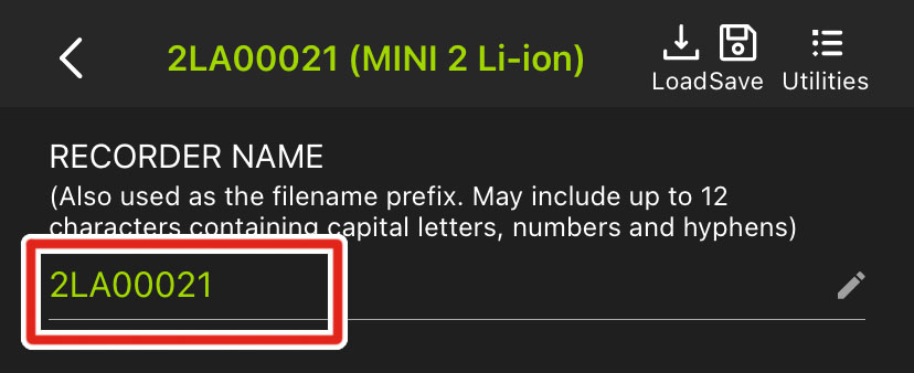 By default, the recorder's name matches its serial number, printed on the side of the enclosure. You can assign a custom name to serve as a quick reminder of where the files were recorded or the project they were associated with. This can be helpful for keeping your files organized during analysis.