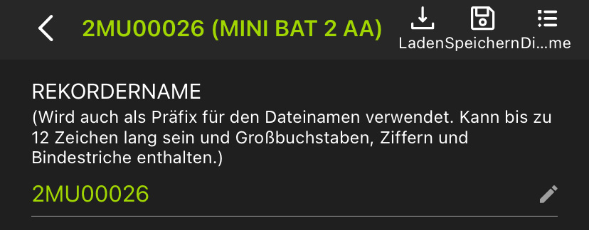Der REKORDERNAME zeigt den aktuellen Rekordernamen als editierbares Textfeld an. Tippen Sie auf den Namen des Rekorders oder auf das Stiftsymbol, um den Rekordernamen zu bearbeiten. Der Standardwert von REKORDERNAME ist die Seriennummer des Rekorders.