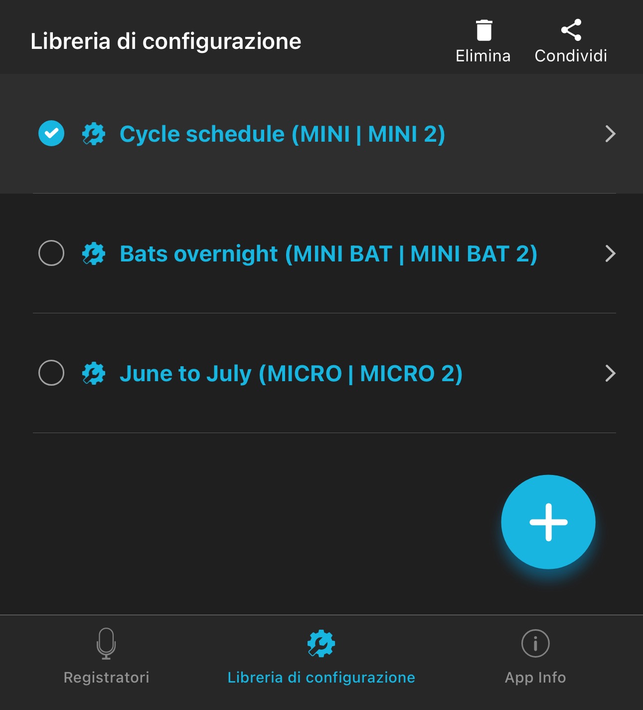 La Libreria di configurazione consente di archiviare, modificare e condividere i file di configurazione. I file di configurazione memorizzano una raccolta quasi completa di impostazioni per un Song Meter Mini Bat 2. I file di configurazione consentono di applicare in modo uniforme le stesse impostazioni a più registratori o per più utilizzi. Per maggiori informazioni, vedere Gestione dei file di configurazione.1