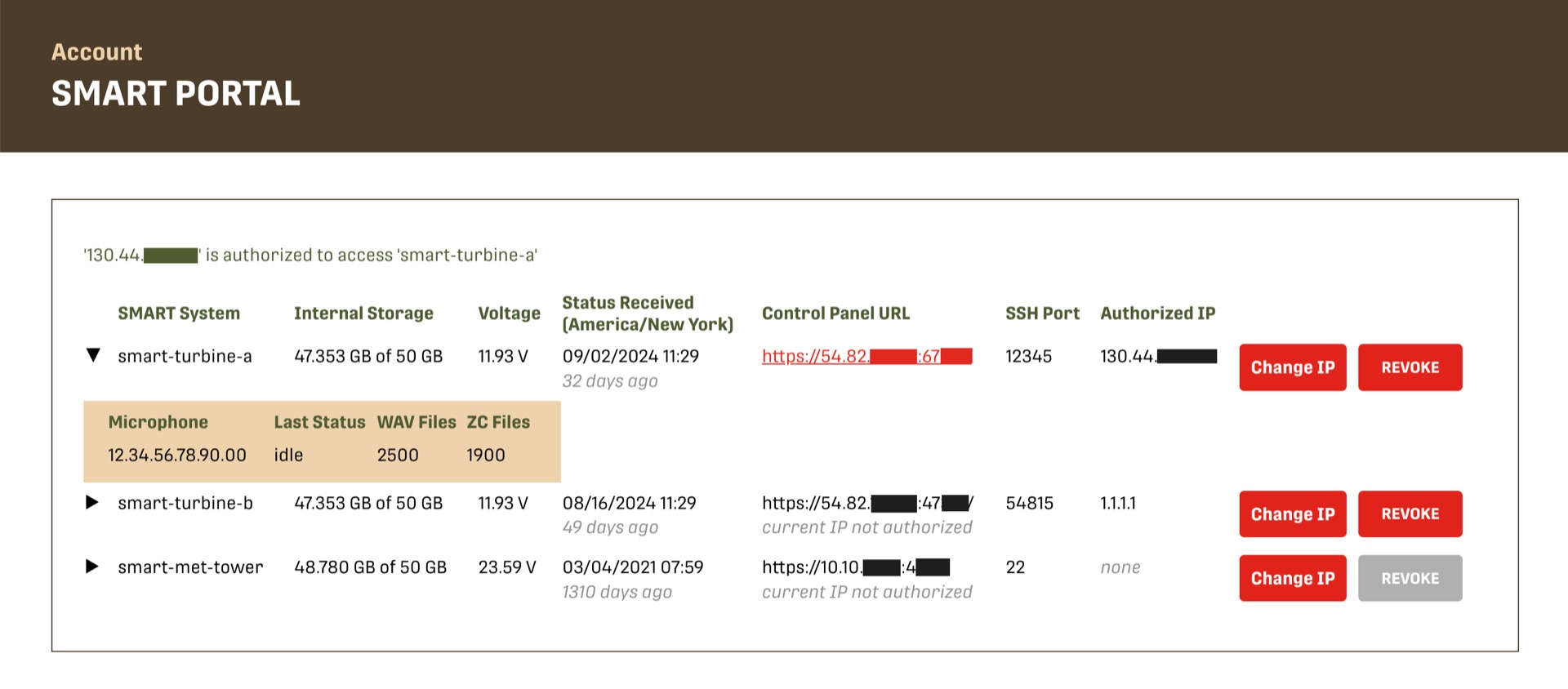 When the SMART IoT Gateway is enabled, a SMART System will communicate with Wildlife Acoustics' IoT Gateway server. Authorized users can log into an account at https://www.wildlifeacoustics.com and open the SMART Portal to view the status of multiple SMART Systems at once, access each system's Control Panel, or access each system's Ubuntu command line via ssh. This creates a user-friendly and secure system for managing SMART Systems from anywhere in the world.