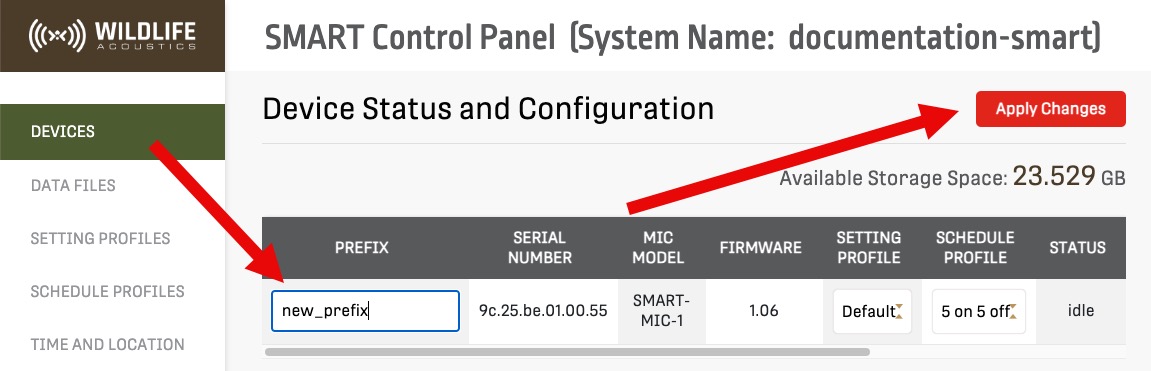 Each microphone attached to a SMART Controller can be given a unique name, or prefix. This prefix is used as part of the file name of any recording, results table, or log file associated with the microphone.